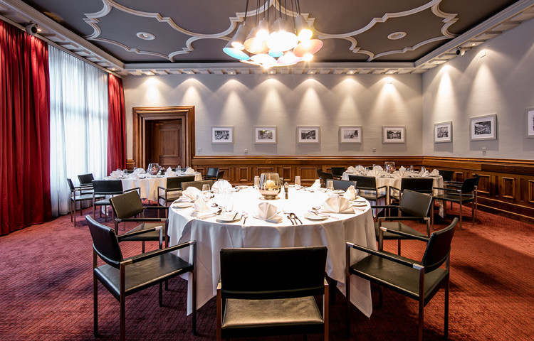 Der mit geschwungener Deckenstukkatur romantisch anmutende Raum bietet sich für mittelgrosse Bankette und Feiern an.