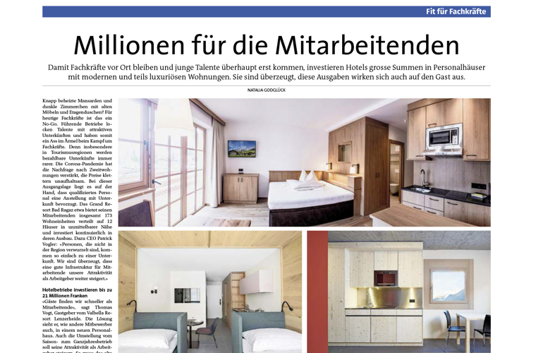 Damit Fachkräfte vor Ort bleiben und junge Talente überhaupt erst kommen, investieren Hotels grosse Summen in Personalhäuser mit modernen und teils luxuriösen Wohnungen. Sie sind überzeugt, diese Ausgaben wirken sich auch auf den Gast aus.